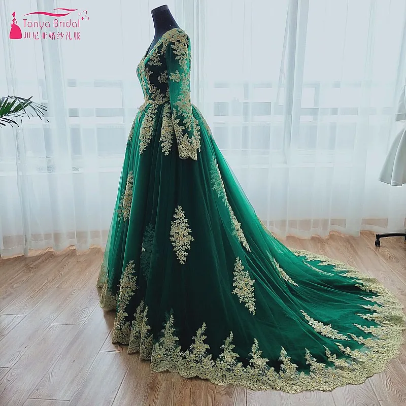 V Neck Long Sleeve Green Wedding Dress With Gold Lace Applique Lace Up On Back A Line Chapel Train Muslim Bridal Gowns Dqg038 Green Wedding Dress Wedding Dresswedding Dress With Gold Aliexpress